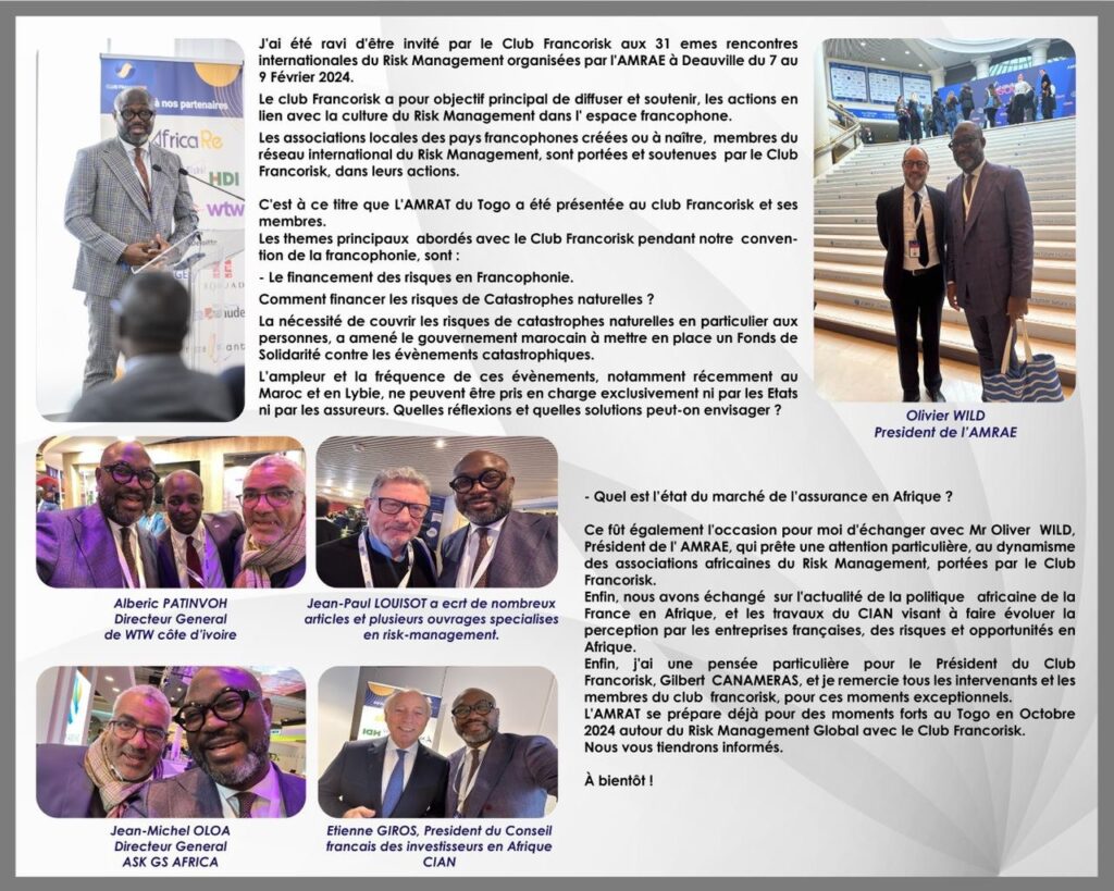 L’association pour le management des risques et des assurances créée en 2023 est, une association engagée dans la formation et la sensibilisation des professionnels à la gestion des risques, basée à Lomé. Elle est membre du club FRANCORISK.